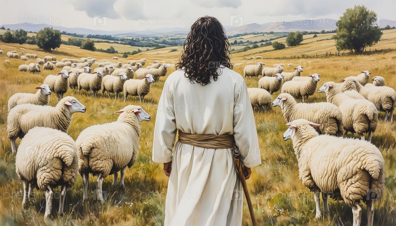 Иисус Христос, Добрый Пастырь с стадом овец акварельная живопись Афиша Христианское стеновое искусство