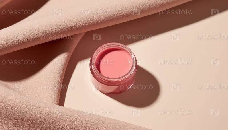Кремниевый румянец или блестящий бальзам для губ в стеклянном горшке на нейтральной бежевой студии Flat Lay