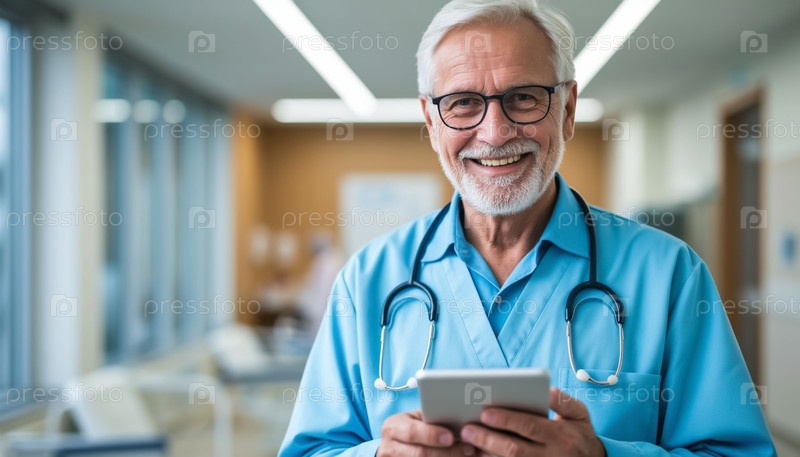 Улыбающийся медицинский работник с планшетом помогает пожилому пациенту в больнице