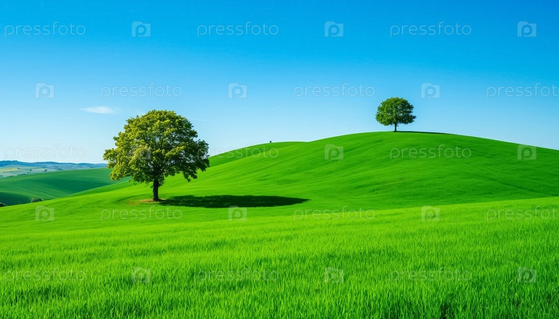 Минималистский пейзаж одного зеленого холма и одного дерева в чистом голубом небе