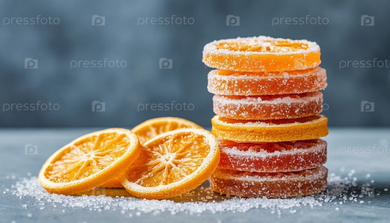 Куча сладких нарезок апельсина на сером фоне