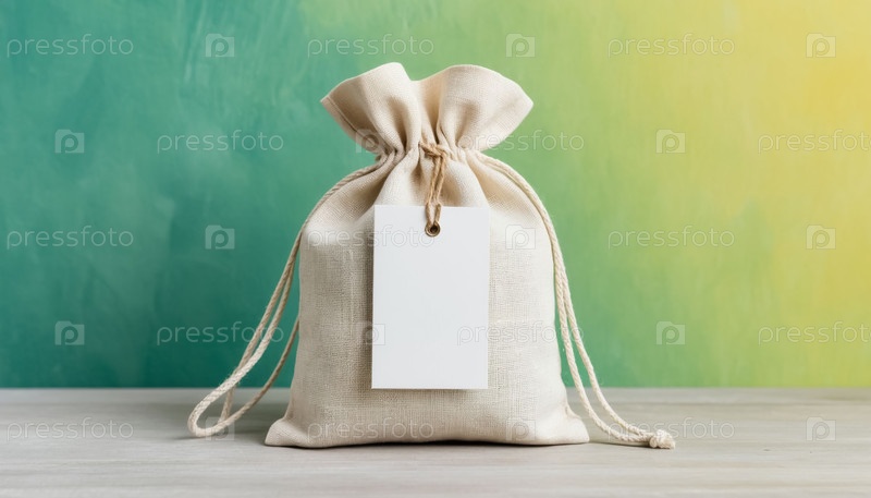 Белый экологически чистый льняной пакет с пустой меткой на зеленом фонде