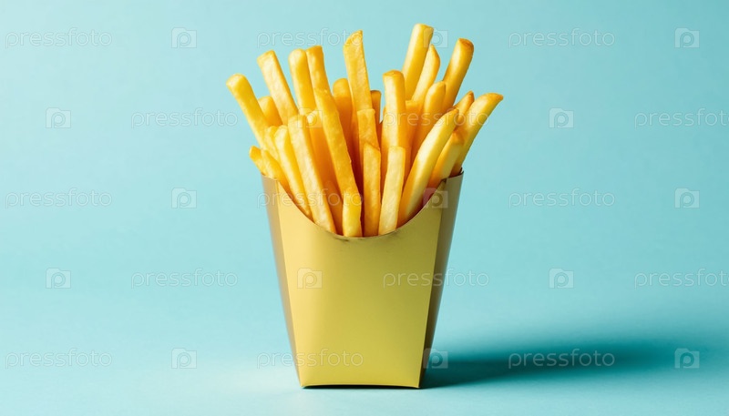 Жареный картофель в золотой упаковке на мягком синем фоне
