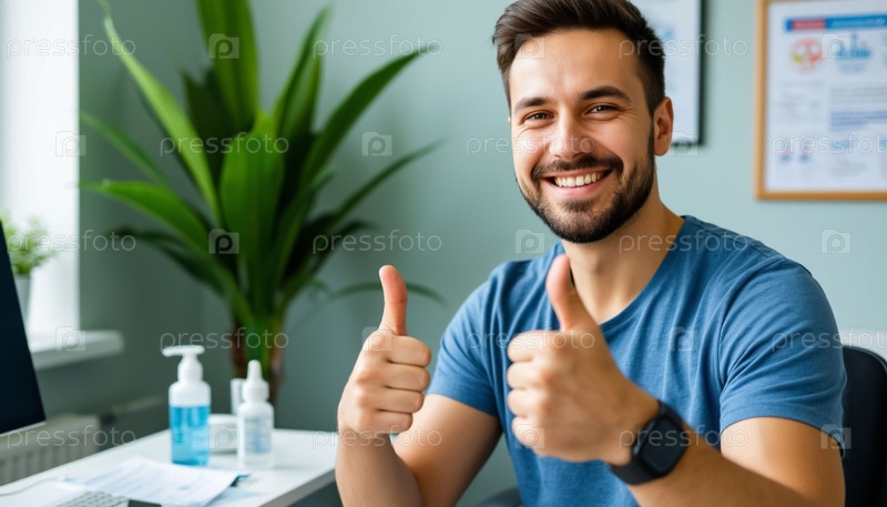 Счастливый удовлетворенный мужчина в кабинете врача Thumbs Up