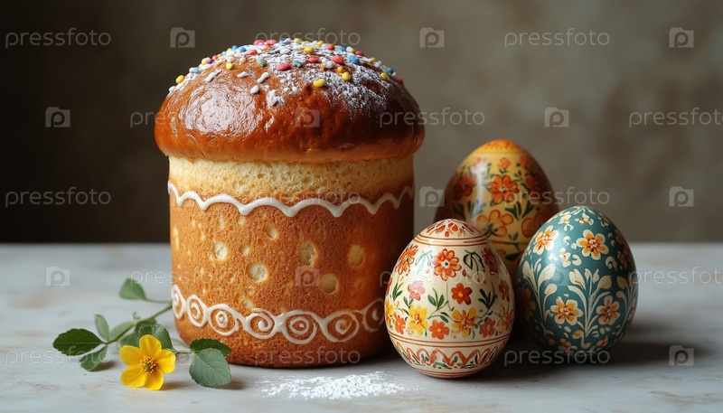 Пасхальный кулич украшен глазурой и яйцами на российском деревянном столе