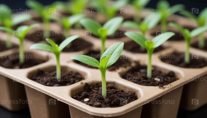 Закрытие свежих зеленых саженцев, растущих в торфяных горшках весной
