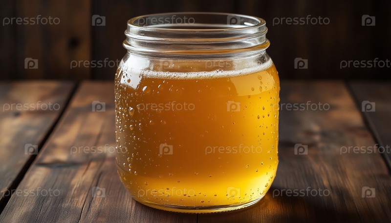 Банка с золотым медом на деревянном рустическом столе, Концепция натурального стеклянного подсластителя
