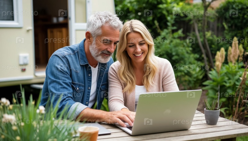 Седой мужчина показывает жене что-то смешное на ноутбуке в саду