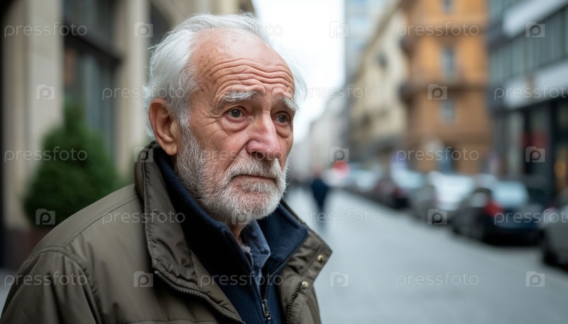 Пожилой мужчина с деменцией сидит на скамейке в городском парке