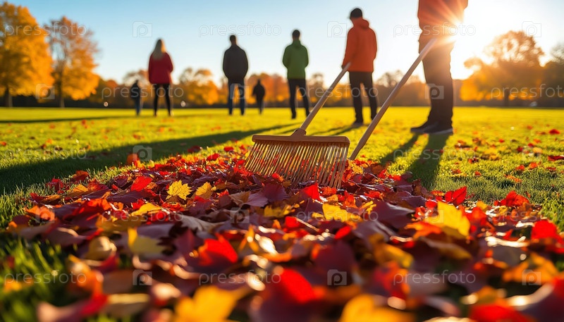 Люди убирают осенние листья в городском парке на площади