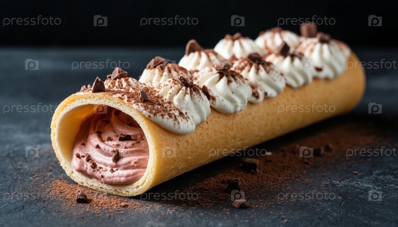 Кремовый пуф или эклер десерт на темном настроенном фоне шоколадный глазурь и начинка