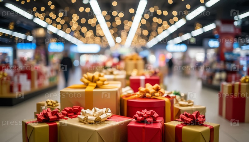 Розничный магазин подарков внутри торгового центра с красочными коробками для подарков спереди и в центре