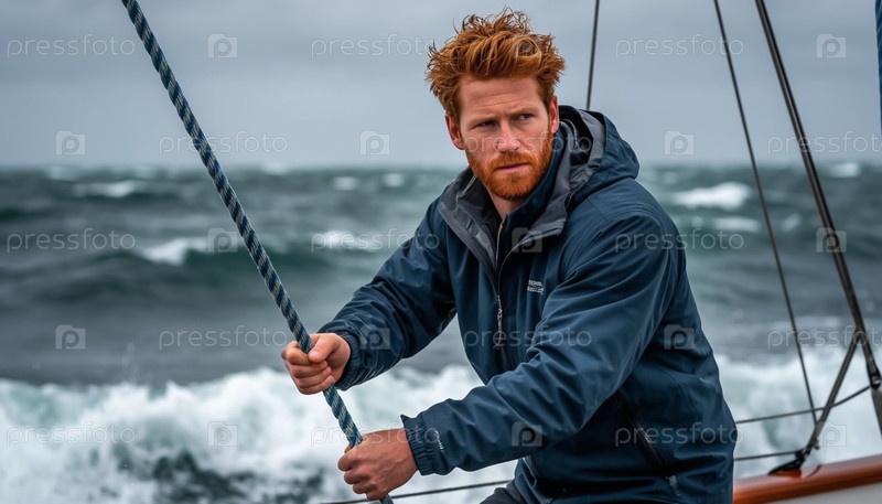 Красноволосый бородатый яхтсмен бросается в бурное море на своей яхте, драматическая морская сцена
