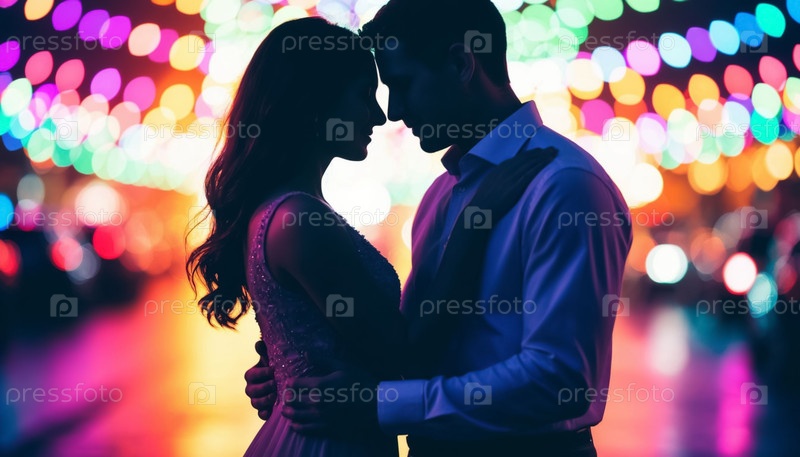 Романтическая пара танцует в ярких огнях боке, оформивших силуэт на праздничном фоне