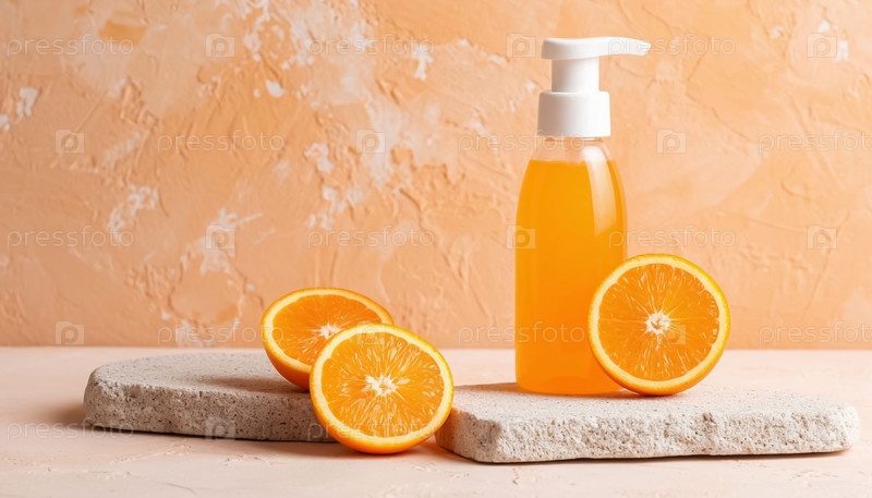 Оранжевый гель для мытья лица на белом каменном стенде