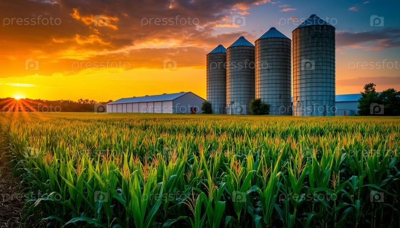 Вид на закат солнца сельскохозяйственных силосов и яркого кукурузного поля