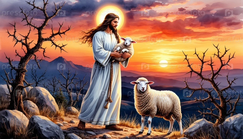 Религиозный флаг Христос держит овец среди шипов Рождество