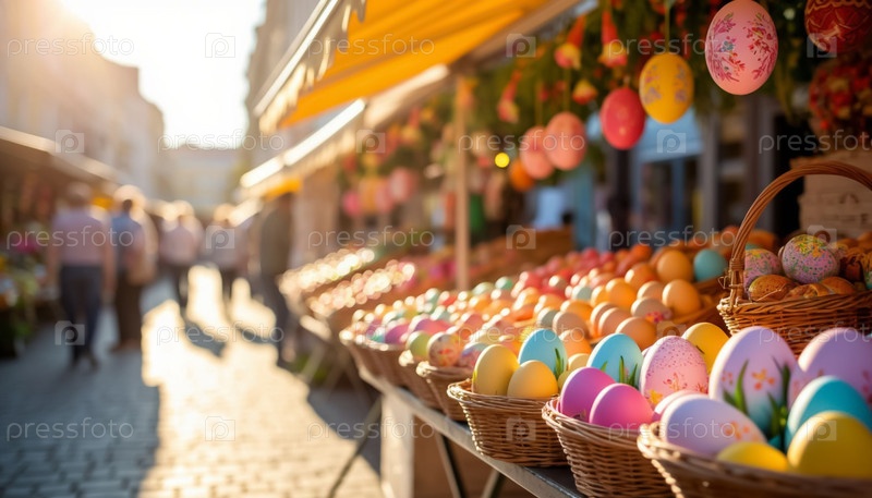 Солнечный пасхальный рынок с яйцами и подарками на киосках ИИ Красочная страница для печати
