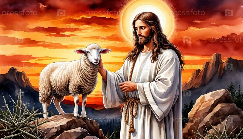 Иисус Христос как Пастырь держит овец среди скал Колючки Цифровое искусство