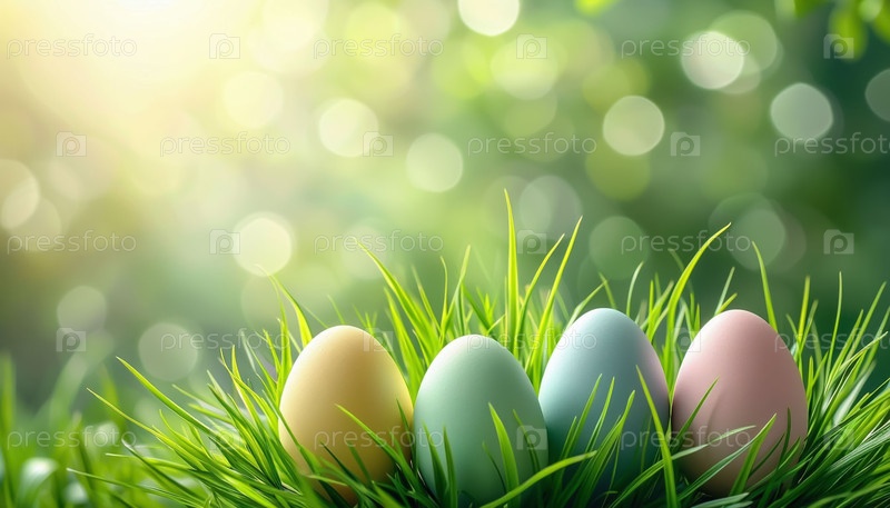 Мокет пасхального баннера с мягкой зеленой основой, на которой изображены окрашенные пастельные яйца