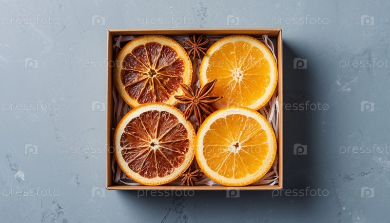 Сушеные нарезы апельсина в подарочной коробке на сером фоне, вкусное угощение