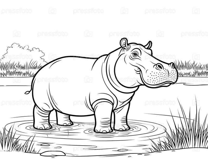 Дружелюбный мультфильм Гиппопотам с простыми линиями, страница рисования раннего обучения