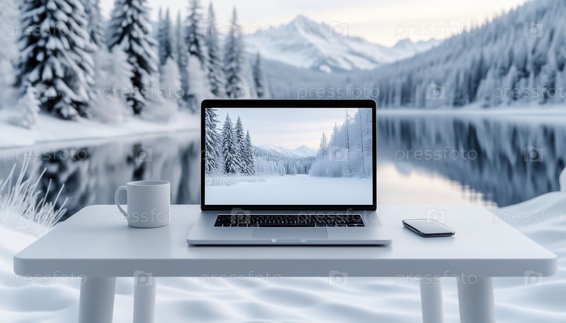 Минималистское рабочее пространство с зимней природой Защита экрана на ноутбуке