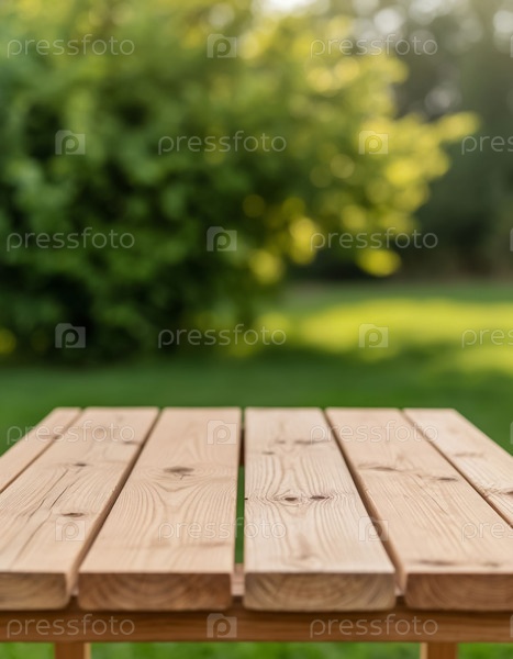 Деревянный настольный подиум на зеленом фоне природы