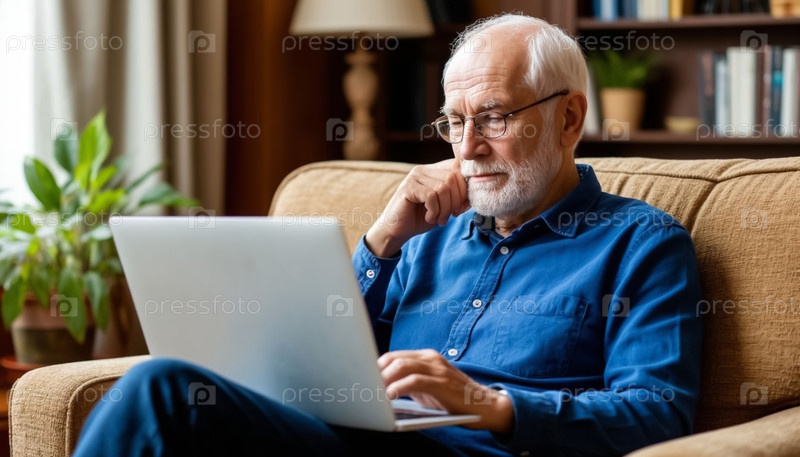 Старый джентльмен просматривает финансовые документы на ноутбуке для планирования недвижимости
