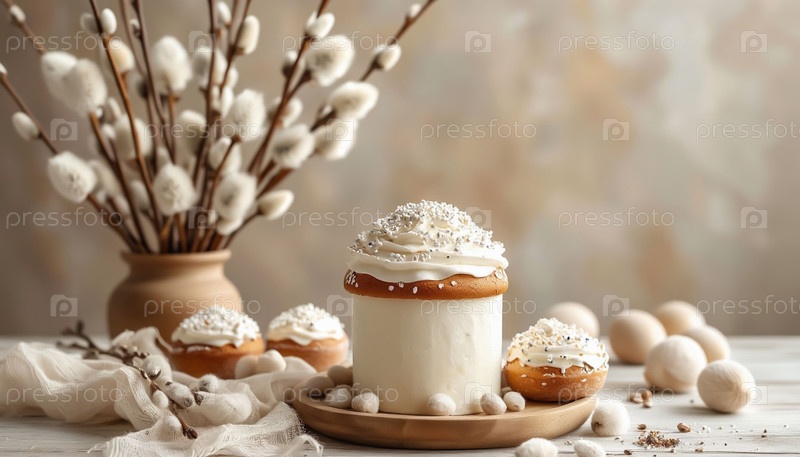 Праздничная пасхальная столовая укладка со стеклянным куличем и украшениями весеннее празднование