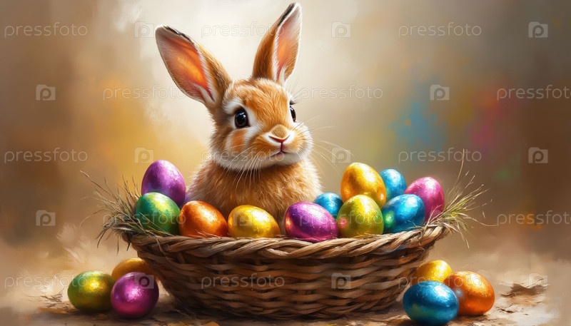 Пасхальный кролик в корзине с радужными яйцами Пастельная художественная иллюстрация