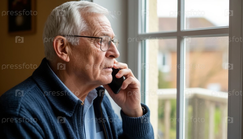 Пожилой мужчина смотрит в окно, разговаривая по телефону один