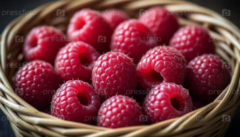 Свежие красные малины в мини-корзине, изолированной на деревенском фоне Здоровая закуска