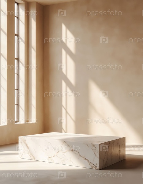 Куб белого мрамора с грубыми краями помещен в бежевую комнату