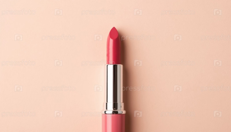 Красная помада на розовом пастельном фоне, презентация косметического продукта