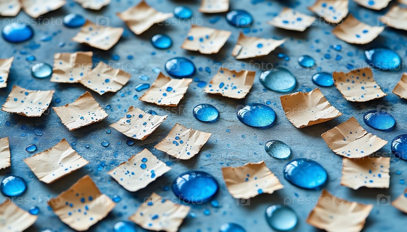 Abstract Background of Капли синей краски и кусочки kraft бумаги