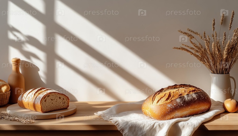 Кухонный баннер белая стена деревянный стол хлебные продукты рустик