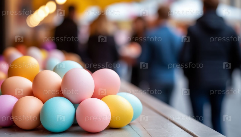 Стол на пасхальном рынке, демонстрирующий красочные пастельные радужные яйца