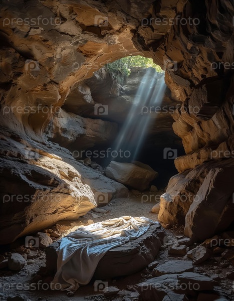 Пасхальный плакат Пустая пещера с могилой и погребальным бельем Иисуса