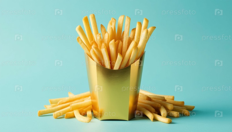Жареный картофель в золотой упаковке на мягком синем фоне
