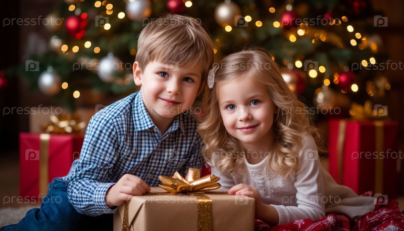 Маленькие дети с рождественскими подарками - праздничный портрет