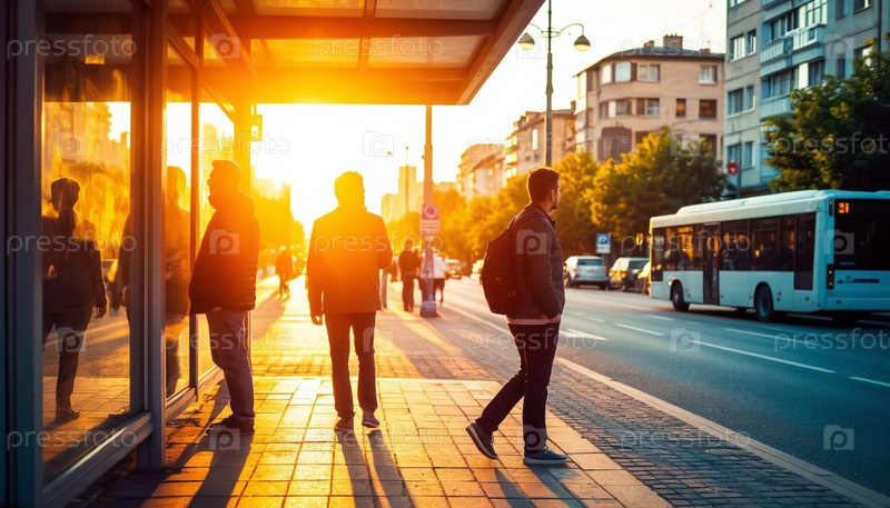 Пассажиры, ожидающие на городской автобусной остановке во время заката солнца AI Цветовая страница