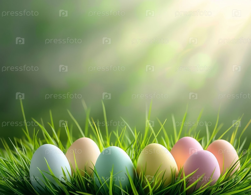 Пастельные радужные пасхальные яйца в зеленой траве с подсветкой, весенняя сцена