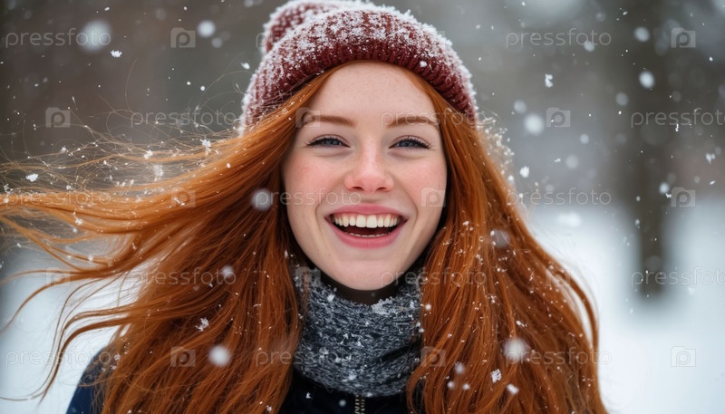 Счастливая рыжеволосая девушка смеется в зимней шляпе Портрет ИИ Красочная страница