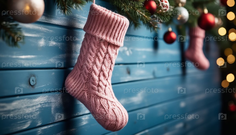 Розовый вязаный носок для новогоднего подарка Голубая стена