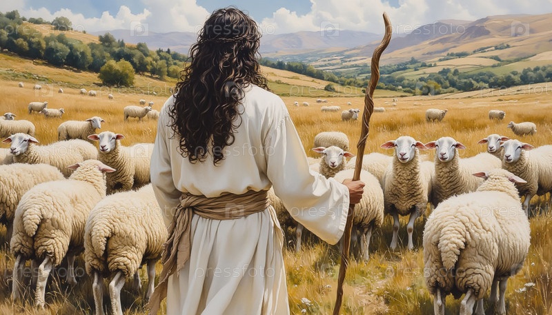 Акварельный плакат Иисуса Пастыря сзади, заботящийся о овцах на поле библейское искусство