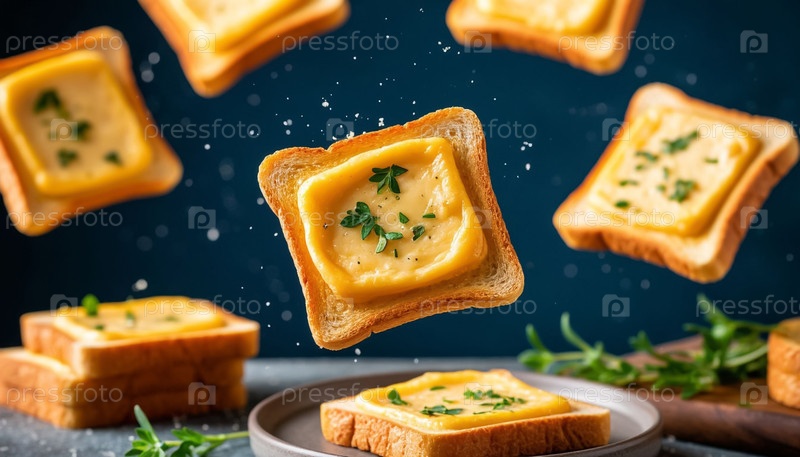 Плавающие тосты с расплавленным сыром на черном фоне