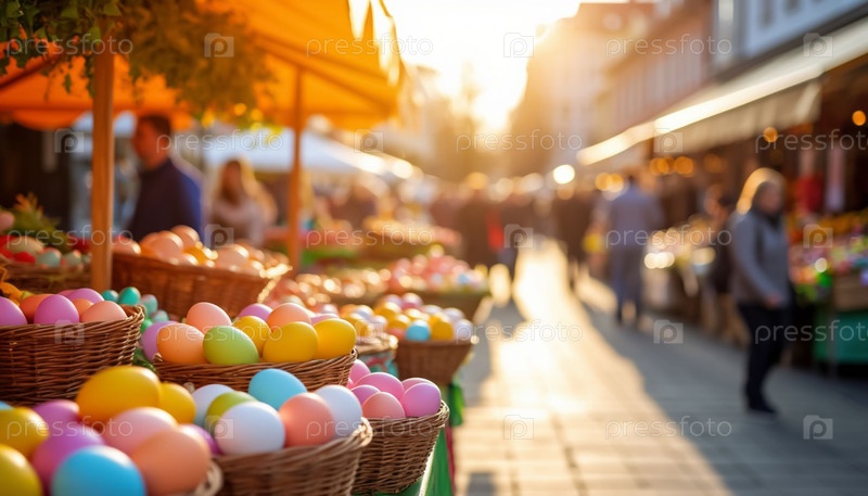 Бут весенней праздничной ярмарки с украшенными яйцами и представляет линейно-художественный лист