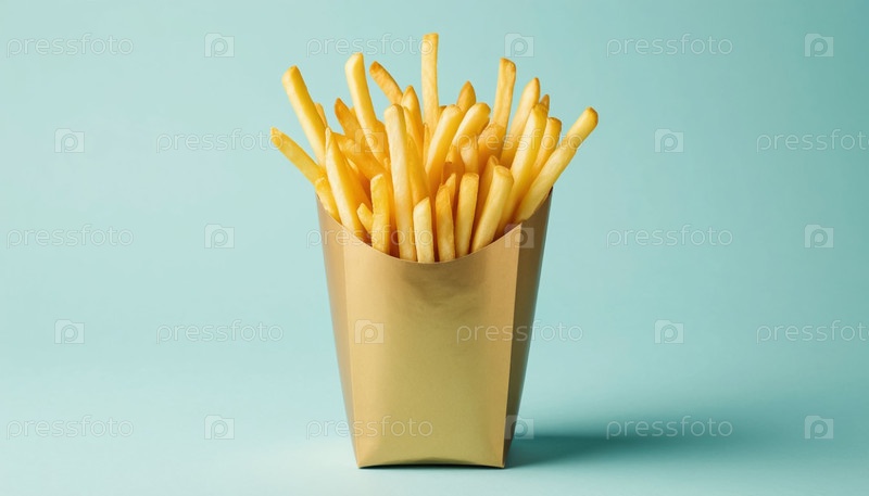 Фри в золотом мешке на пастельно-синем фоне