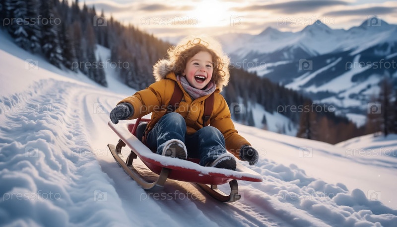 Зимняя детская сцена, радостный малыш наслаждается катанием на санях на природе